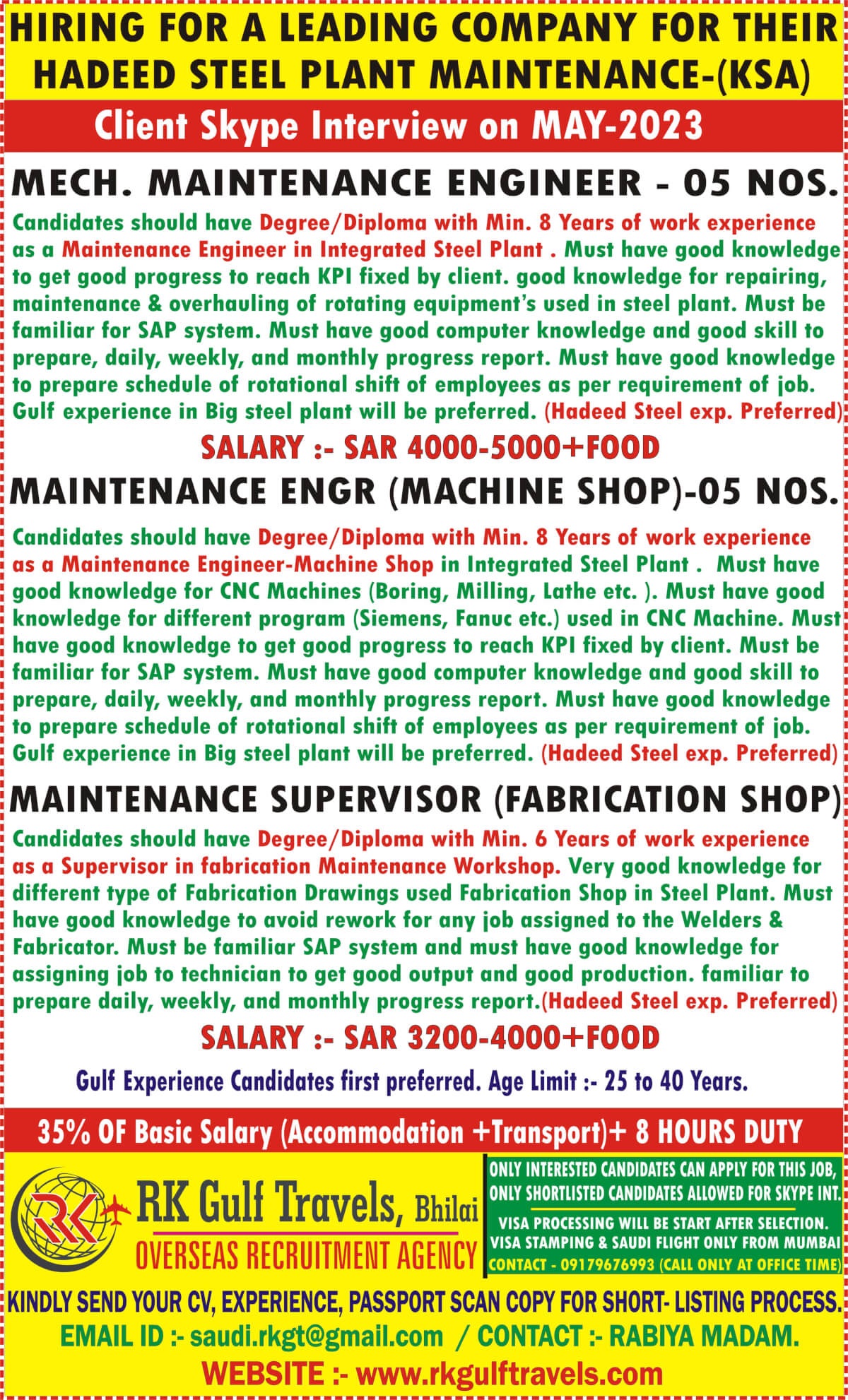 Hadeed Steel Plant Maintenance - Hiring for KSA