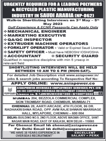 Polymers & Recycled Plastic Manufacturing Industry - Hiring for KSA
