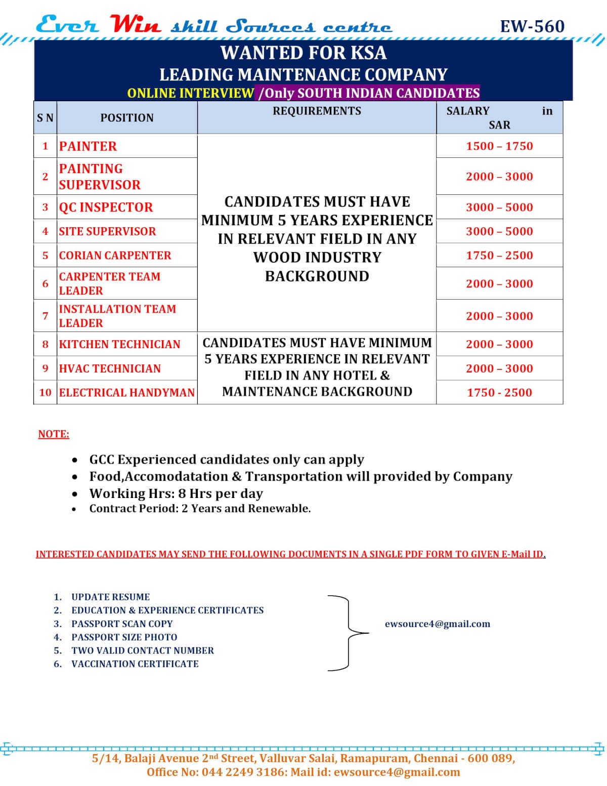GCC experienced Candidates only can apply, Working hours 8 hours per day. Contract period : 2 years and renewable. Only South Indian Candidates