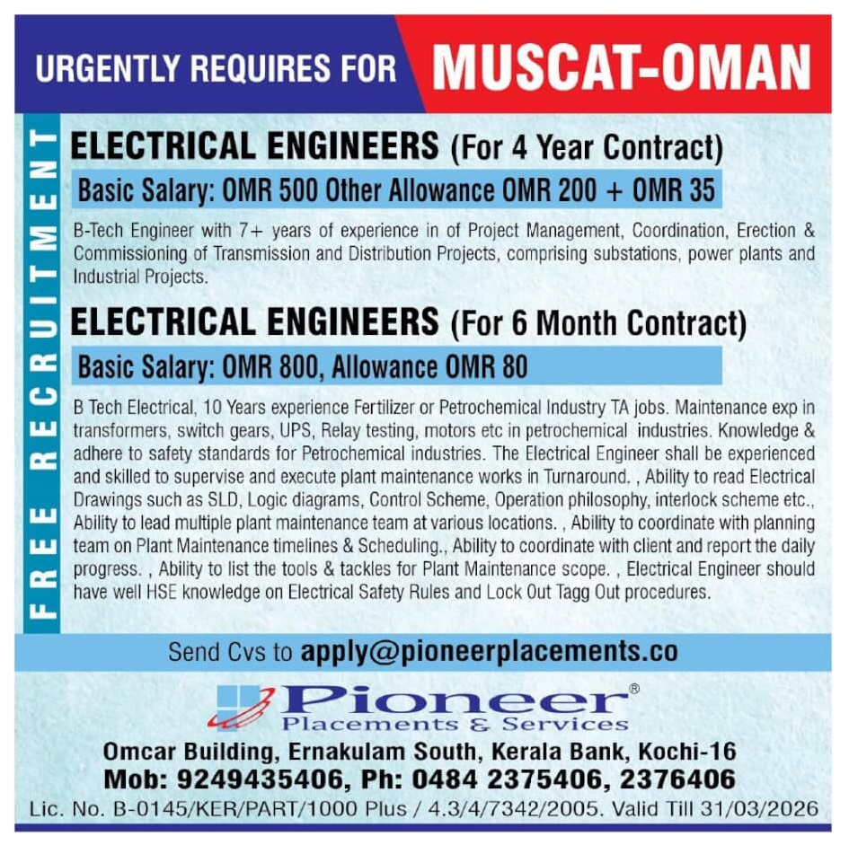 Email: apply@pioneerplacements.co / 9249435406, 0484 2375406, 2376406