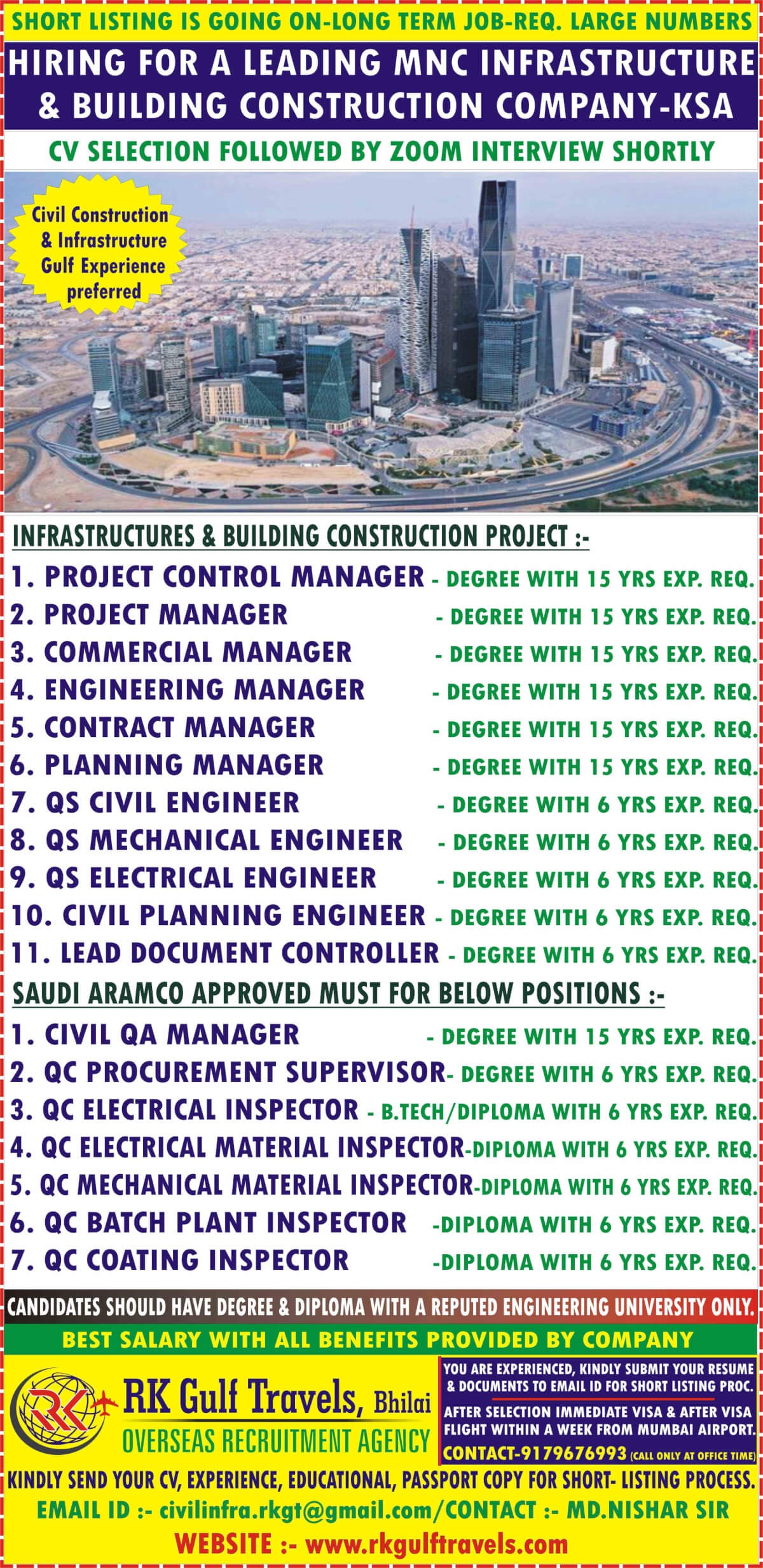 Civil Construction & Infrastructure Gulf Experience preferred. Candidates should have Degree & Diploma with a reputed Engineering University Only