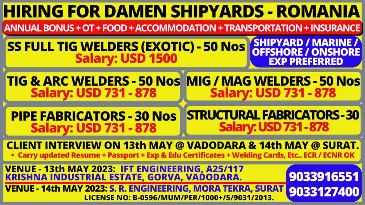 Walk-in-interview on 13th May 2023 at Vadodara: M/s. IFT Engg. P.Ltd, A/25-117, Krishna Ind. Estate, BIDC Gorwa, Vadodara, Gujrat & 14th May at Surat : S. R. Engineering, Mora Tekra, Surat, Gujarat.
