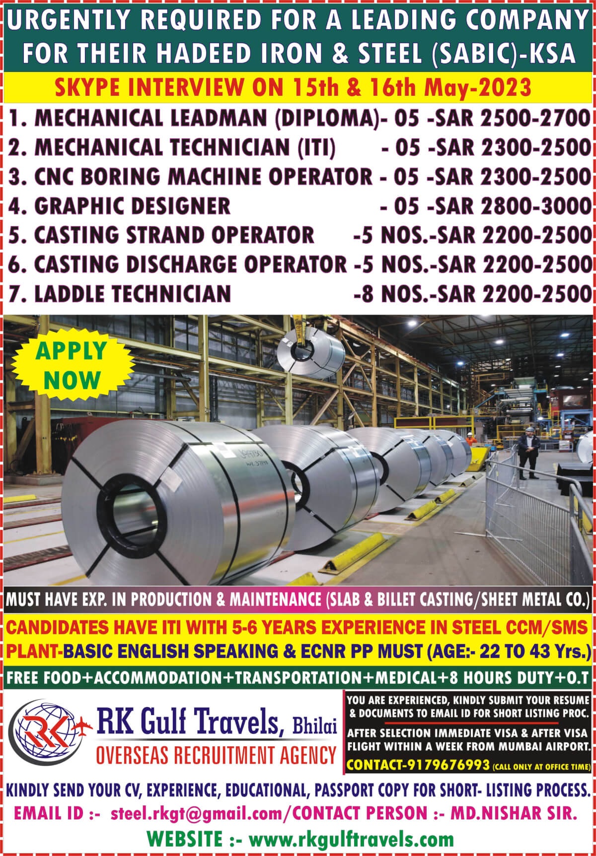 Must have experience in Production & Maintenance (SLAB & Billet Casting/Sheet Metal Co.) Candidates have ITI with 5-6 yerars experience in Steel CCM/SMS Plant - Basic English Speaking & ECNR Passport must. Age:- 22 to 43 years,