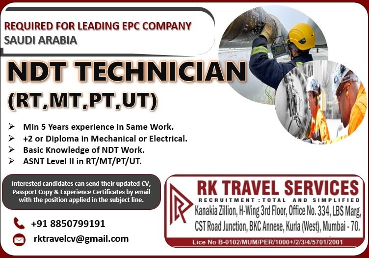 Min. 5 years experience in same Work, +2 or Diploma in Mechanical or Electrical. Basic Knowledge of NDT Work. ASNT Level II in RT/MT/PT/UT.