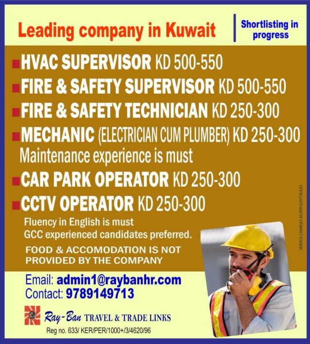 | Mechanic (Electrician cum Plumber) | 300 KWD | |