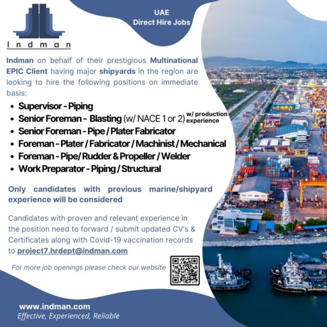 Only Canddidates with previous Marine/Shipyard experience will be considered.