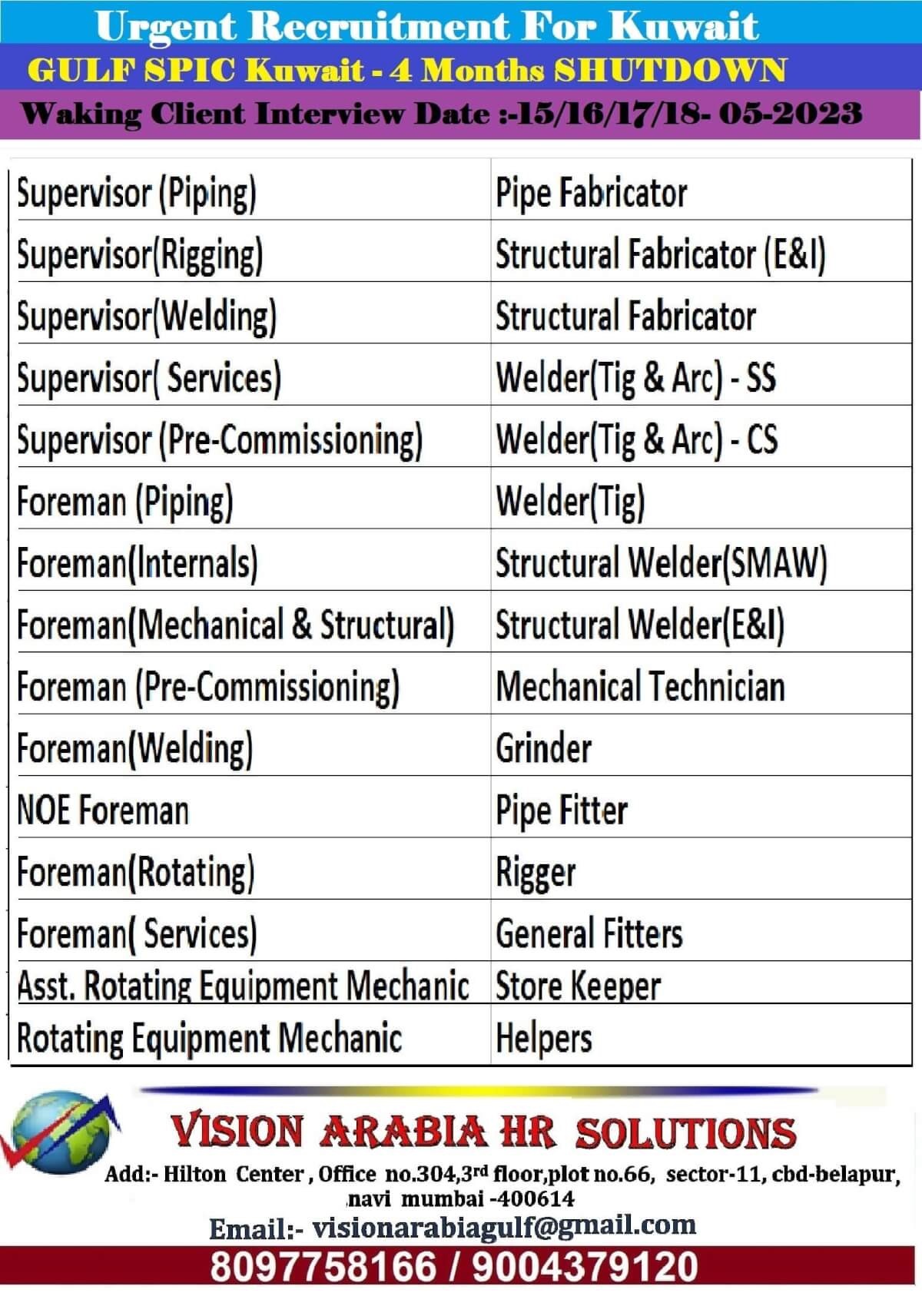 Gulf spic Kuwait vacancy - Large recruitment to Shutdown project