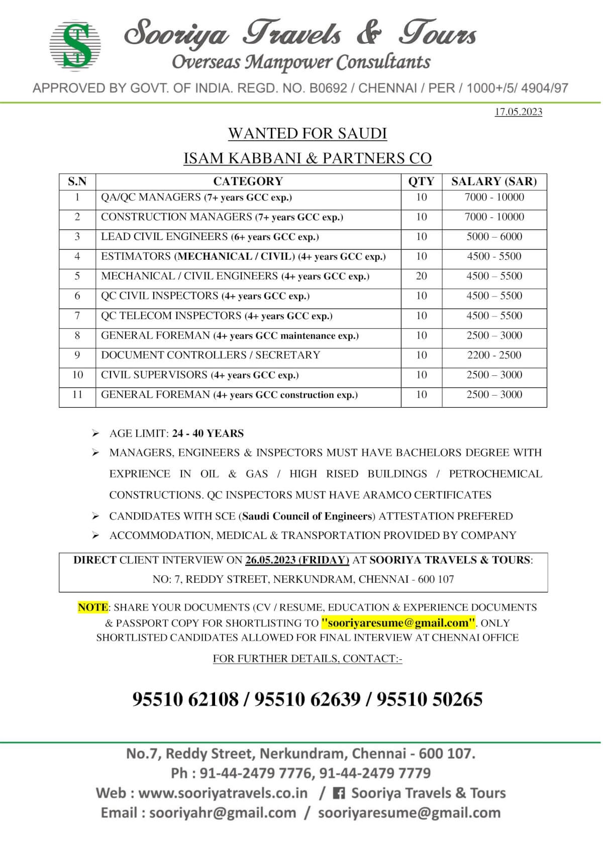 Age Limit : 24 to 40 years, Managers, Engineers & Inspectors must have Bachelors Degree with experience in Oil & Gas / High Rised Building / Petrochemical Constructions. QC Inspectors must have Aramco Certificates. Candidates with SCE Attestation preferred.