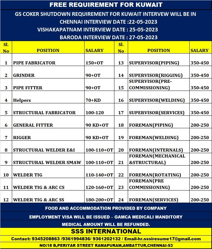 Food and Accommodation provided by Company, Employment Visa will be issued - GAMCA Medical Manditory, Medical Amount will be Refunded