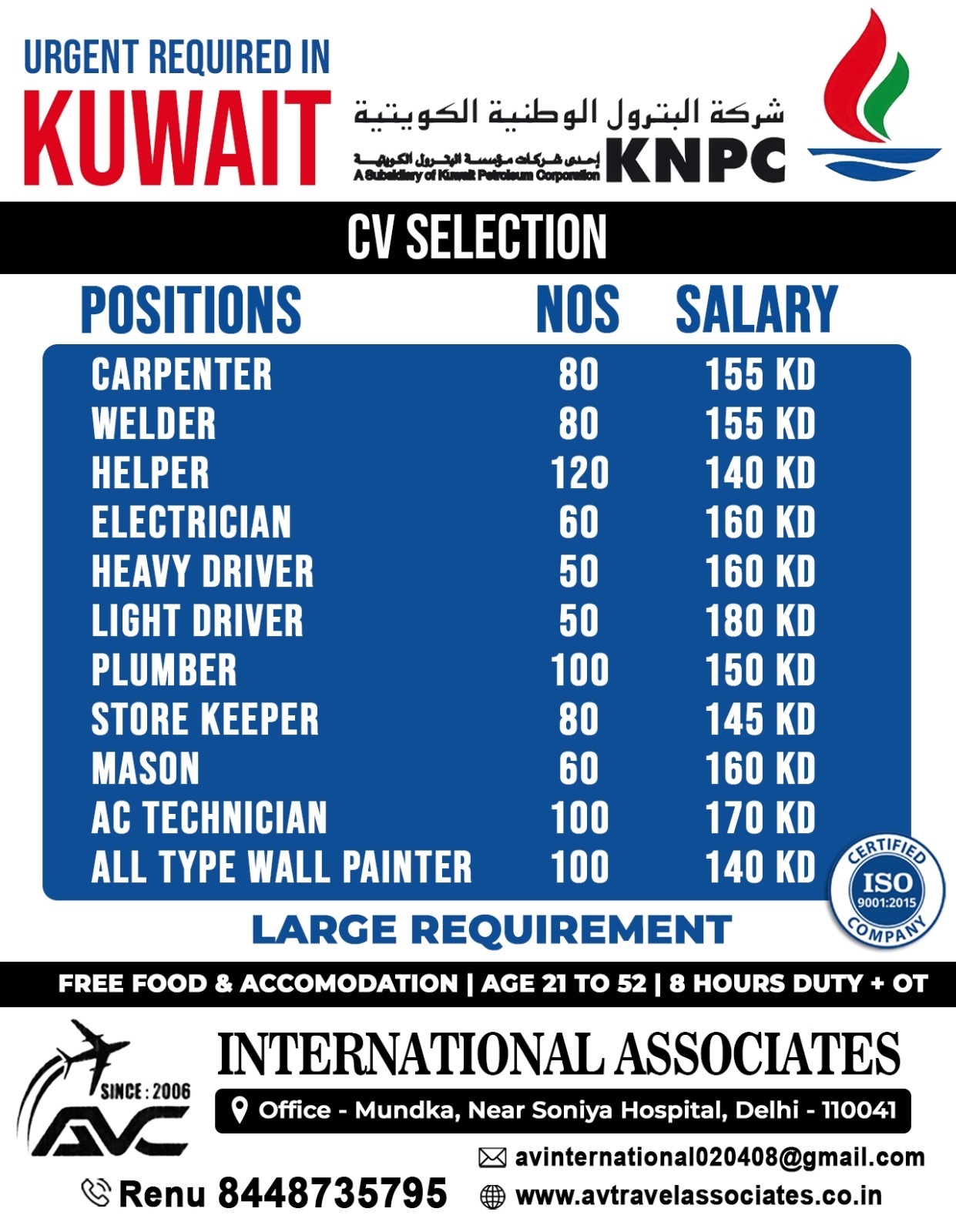 Experience candidates required. Age 21 to 52 years. 8 Hours duty + OT