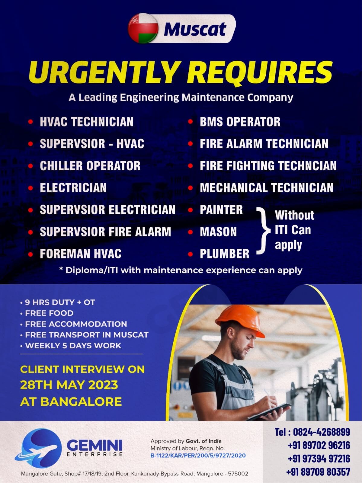 Free Food, Accommodiation & Transportation in Muscat provided by Company