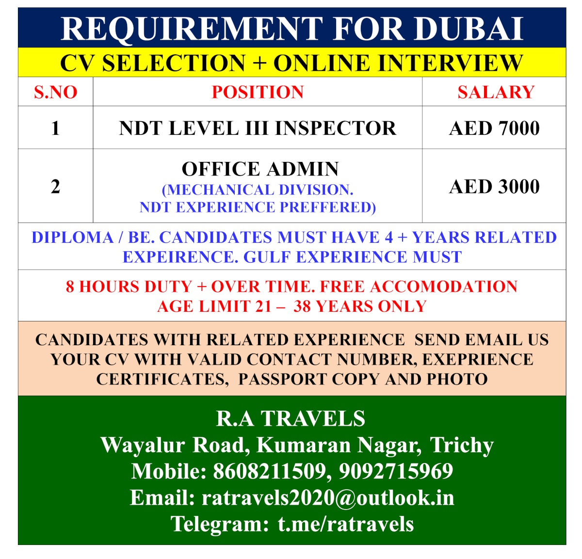 Diploma / BE. Cadidates must have 4 + years related experience. Gulf experience must. 8 hours duty + Over Time + Age Limit 21 to 38 years only