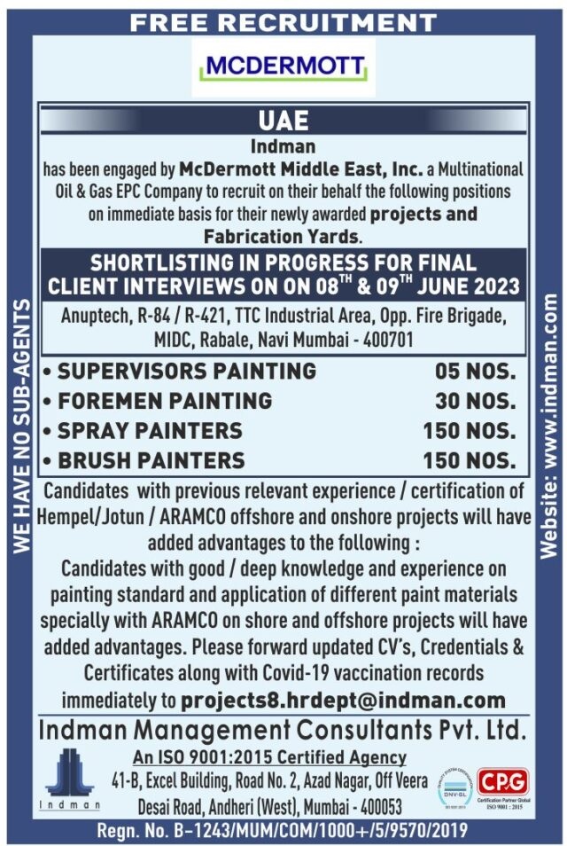 Candidaes with previous relevant experience / Certification Hempel/Jotun/Aramco Offshore and Onshore Projects will added advantages.