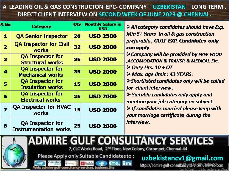 All Category Candidares should have Exp. Min. 5+ years in Oil & Gas Construction. Preferable, Gulf Exp. Candidates only can apply. Max. Age Limt 43 years. If Candidates married please keep with your marriage certificate during the interview.