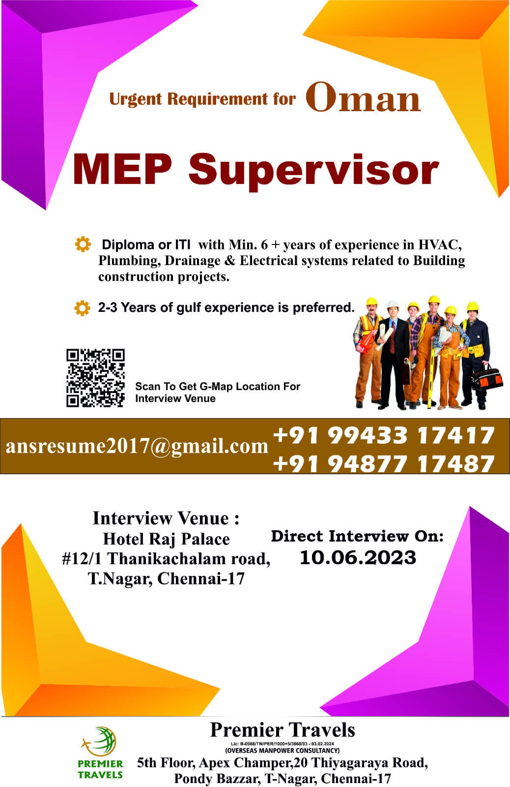 Diploma or ITI with Min. 6+ years of experience in HVAC, Plumbing, Drainage & Electrical Systems related to Building Construction Projects. 2-3 years of gulf experience is preferred.