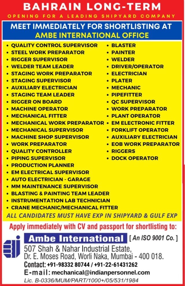 All Candidates must have exp. in Shipyard & Gulf Experience.