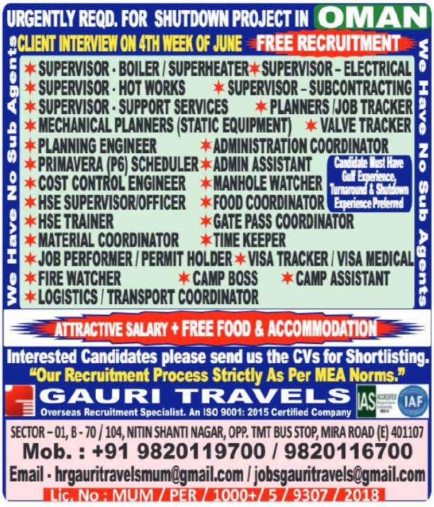 Email: hrgauritravelsmum@gmail.com / jobsgauritravels@gmail.com / 9820119700, 9820116700