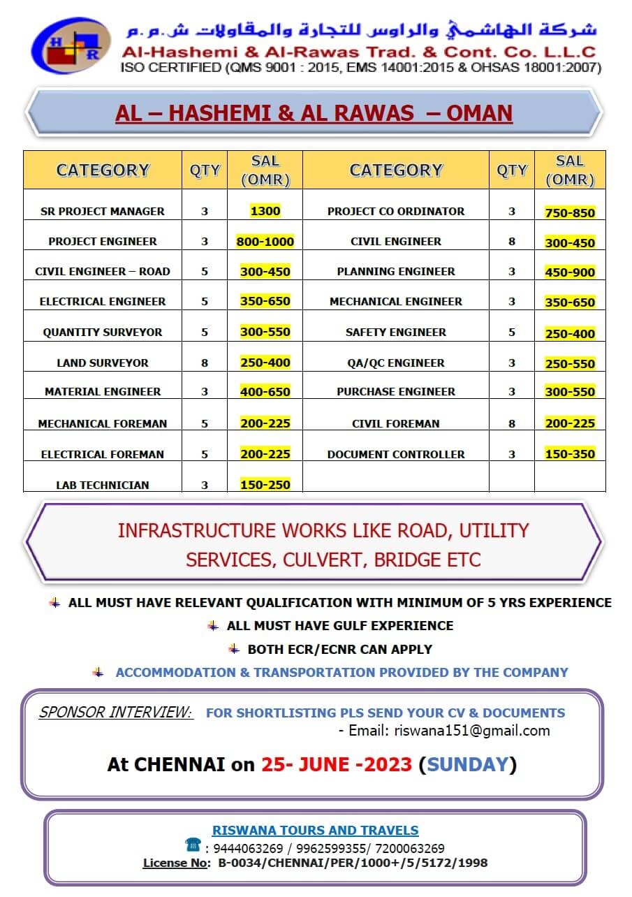 | Civil Engineer - Road | 05 | 450 OMR |