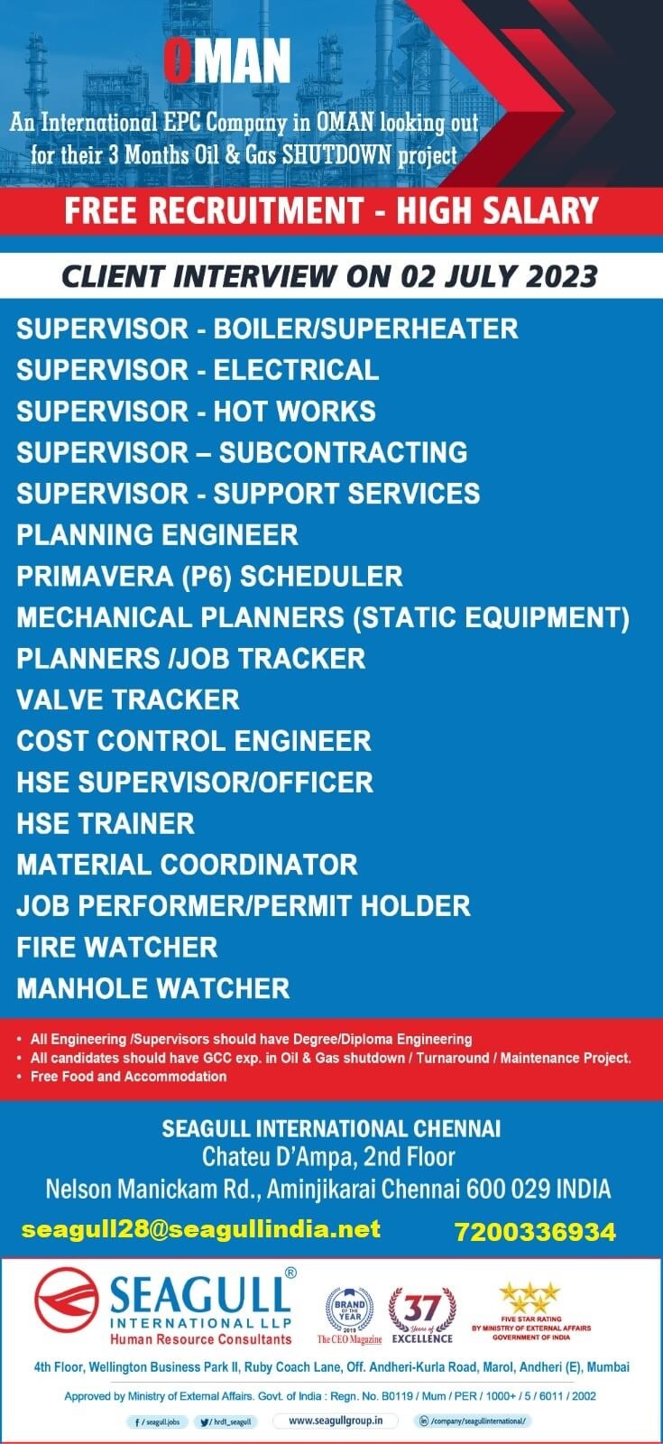 All Engineering / Supervisorss should have Degree /Diploma Engineering. All Candidates should have GCC experience in Oil & Gas Shutdown / Turnaround / Maintenance Project