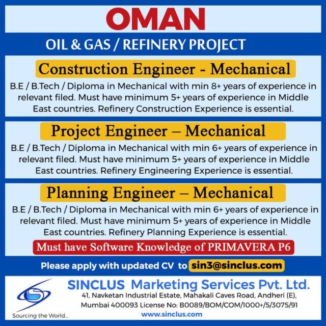 B. E. / B. Tech / Diploma in Mechanical with Minimum 8 + Years of experience in relevant field. Must have minimum 5+ years of experience in Middle East Countries, Refinery Construction experience is essential