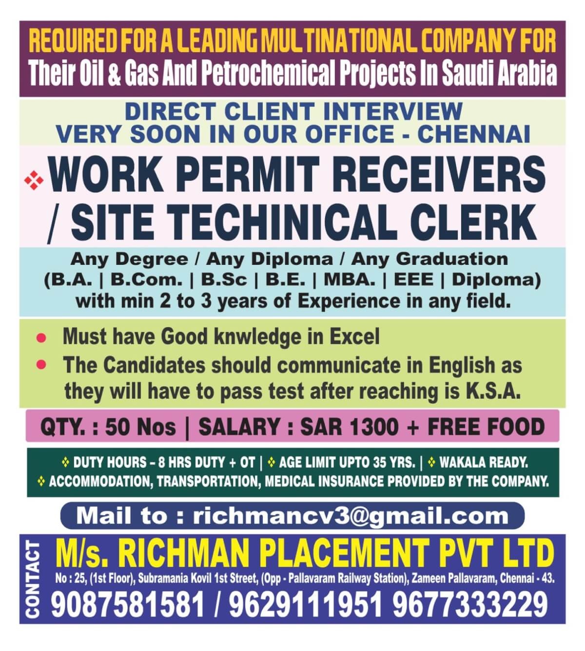 | Work Permit Receivers / Site Technical Clerk | 50 | 1300 SAR |