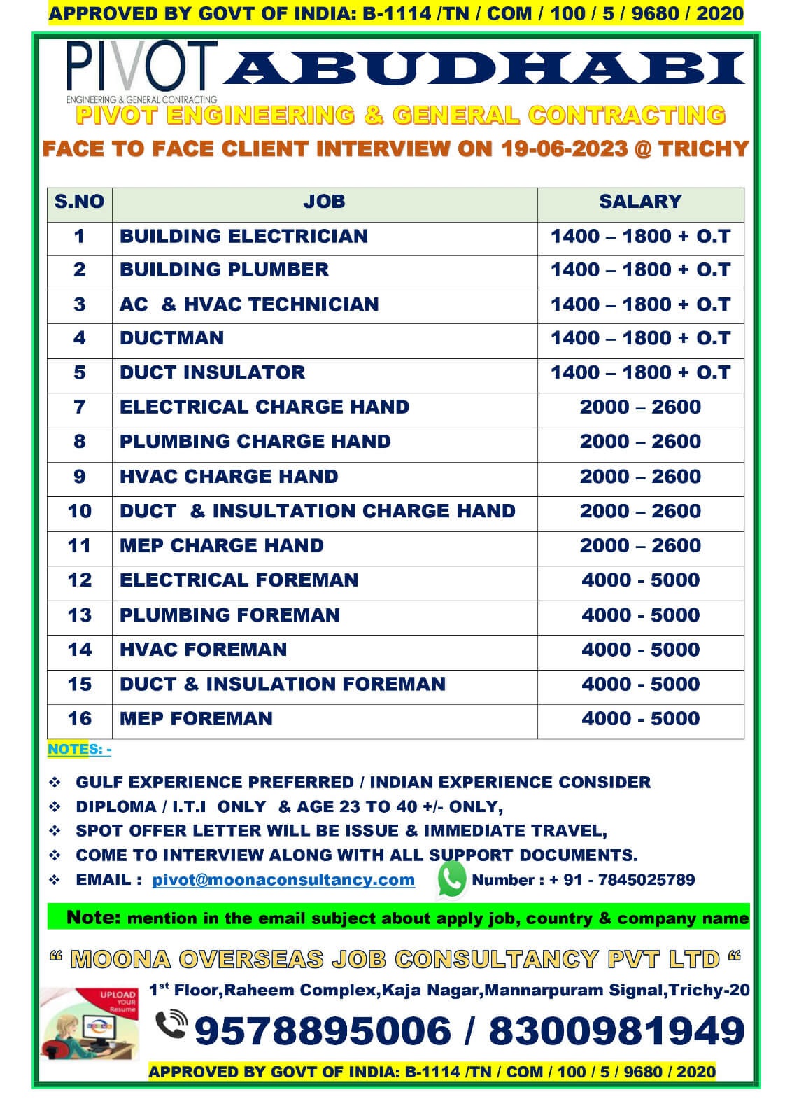Gulf Experience preferred, Indian experience consider, Diploma / I.T.I Only & Age 23 to 40 only. Spot Offer Letter will be issue & Immediate Travel.