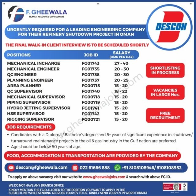 Descon Oman vacancies - Free Recruitment Refinery Shutdown Project
