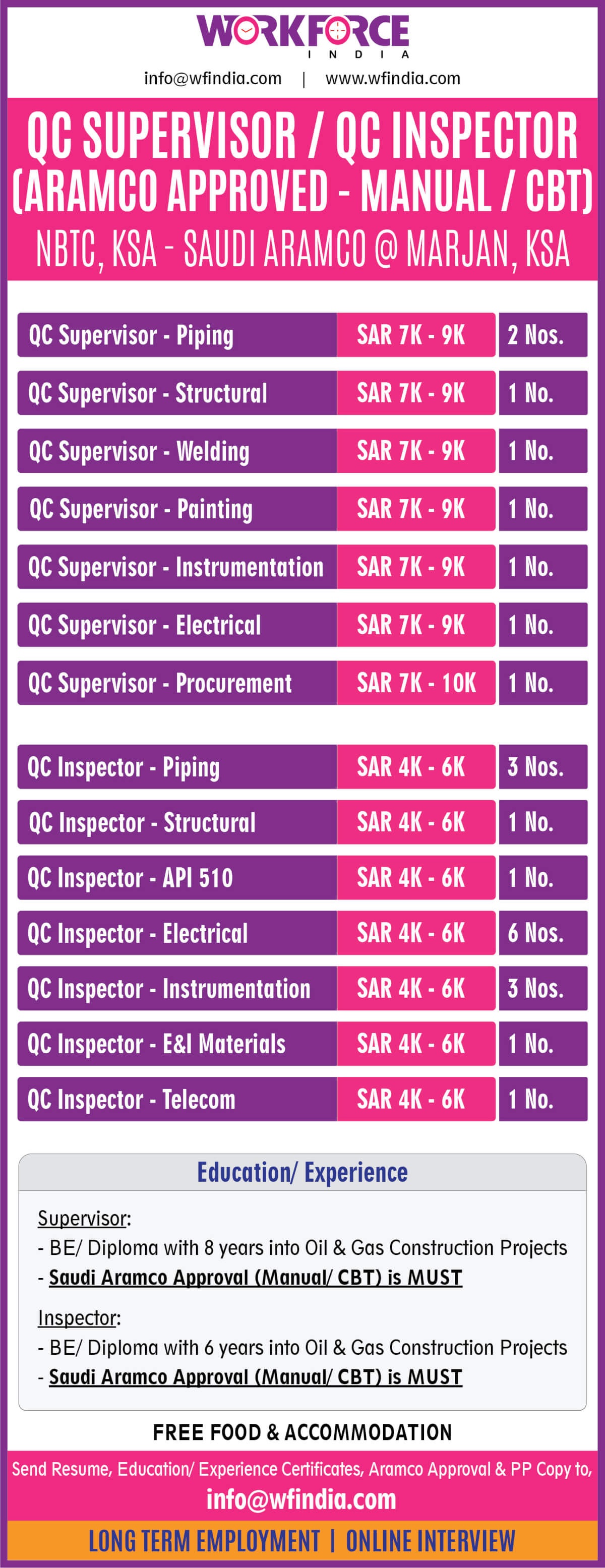 Inspectors : BE / Diploma with 6 years experience into Oil & Gas Construction Projects, SAudi Aramco Approval (Mannual/CBT) is must.
