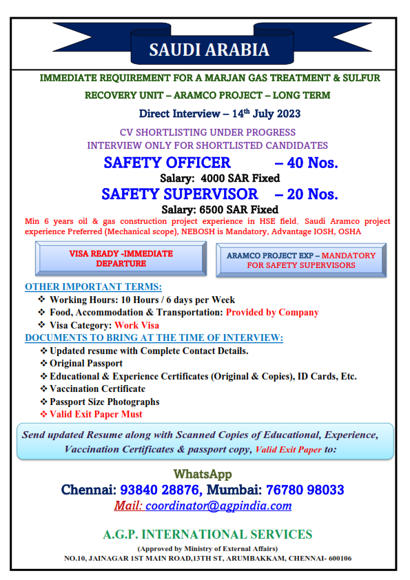 Minimum 6 years Oil & Gas Construction Project experience in HSE field. Saudi Aramco Project experience preferred (Mechanical Scope.) Nebosh is Mandatory, Advantage IOSH, OSHA