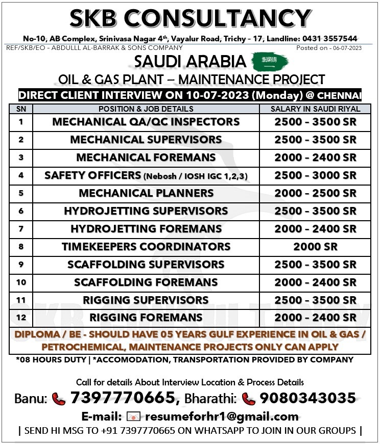 Diploma / BE - should have 05 years Gulf experience in Oil & Gas, Petrochemcial, Maintenance projects only can apply.