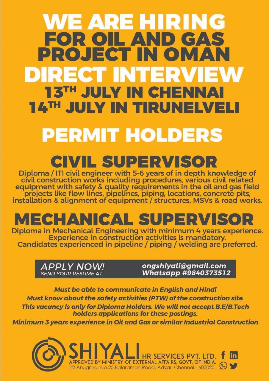 Minimum 3 years experience in Oil & Gas or Similar Industrial Construction. This Vacancy is only for Diploma Holders, will not accept B. E / B. Tech holders applications for these positions. Must know about the safety activities (PTW) of the construction site. mMust be able to communicate in English and Hindi