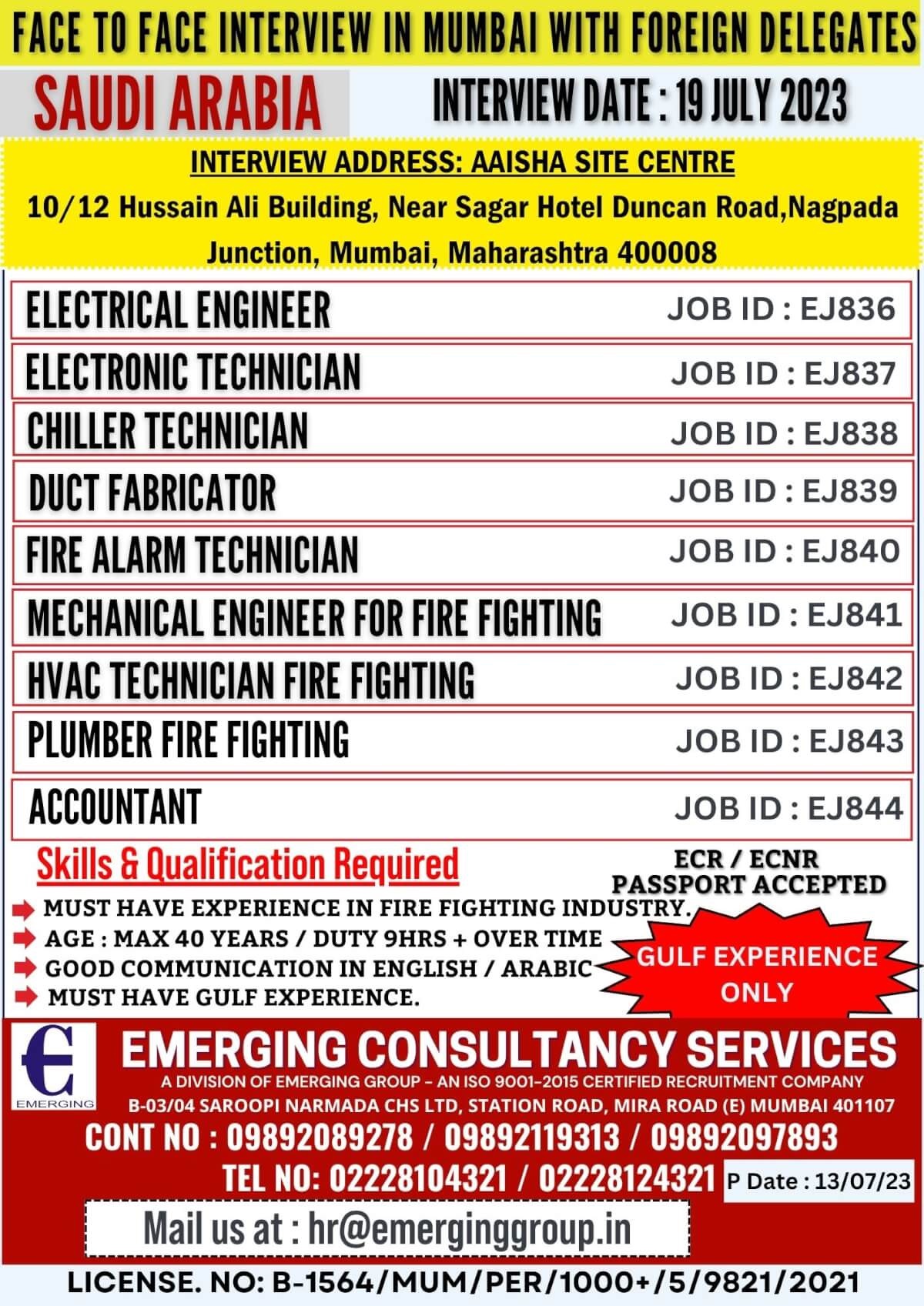 Must have experience in Fire Fighting Industry, Age Max. 40 years / Duty 9 hours + OT, Good Communication in English / Arabic, Must have Gulf experience, ECR/ECNR Passport Accepted.