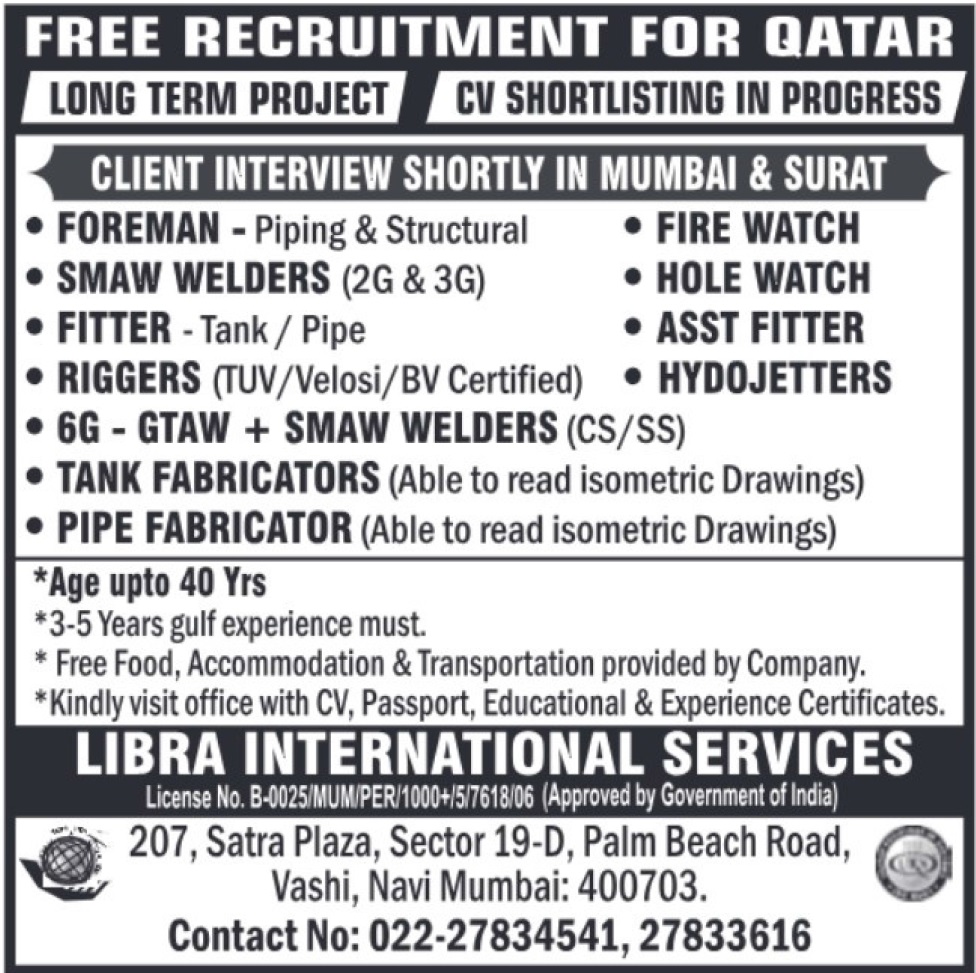 All Candidates must have 3 to 5 years gulf experience. Age upto 40 years.