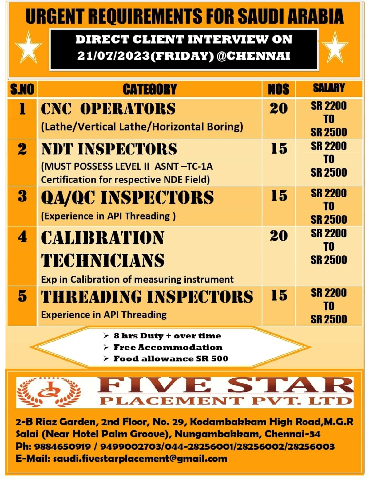 Email: saudi.fivestarplacement@gmail.com / Contacts : 9499002703, 044-28256001, 28256002, 28256003