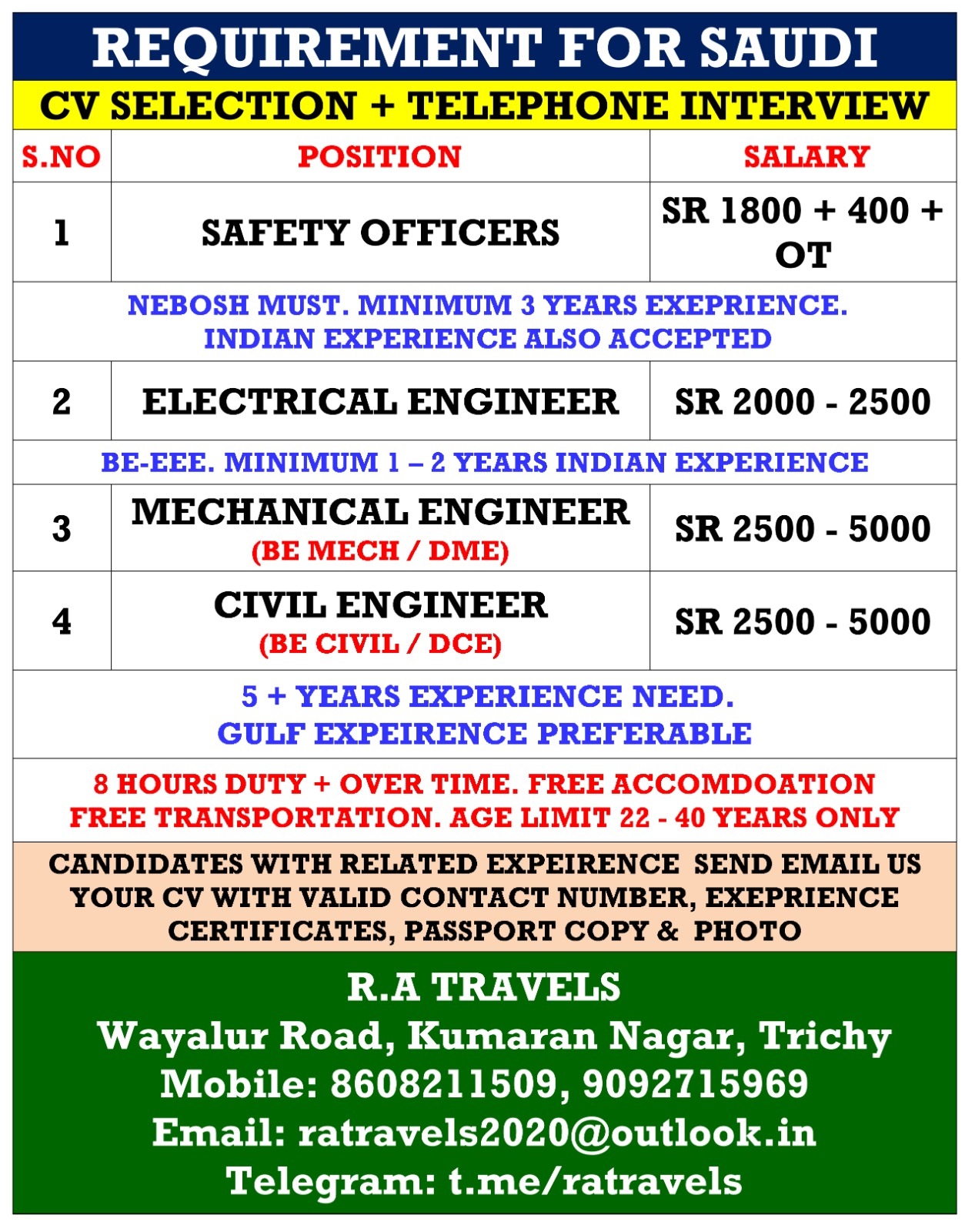 All Candidates should have 5 + years experience need. Gulf Experience preferable. 08 hours duty + Over Time. Age Limit 22 to 40 years only