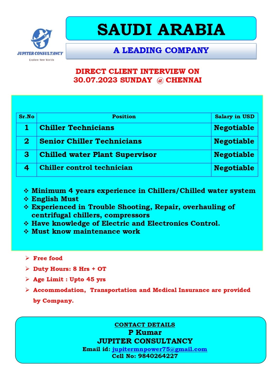 Minimum 4 years experience in Chiller/Chilled water system, English Must, Experience in Trouble Shooting, Repair, Overhauling of Centrifugal Chiller, Compressors. Have Knowledge of Electric and Electronics Control. Must know maintenance work. 8 hours duty + OT, Age limit Upto 45 years.
