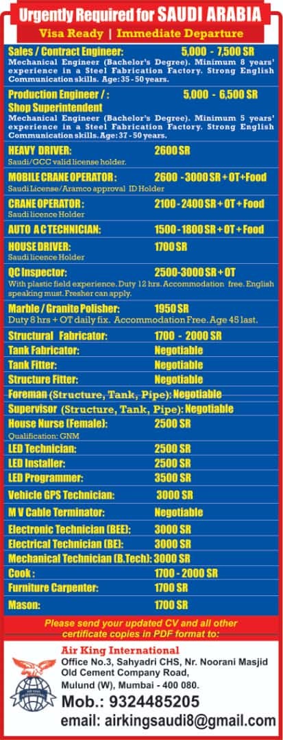 Email: airkingsaudi8@gmail.com / Contacts : 9324485205