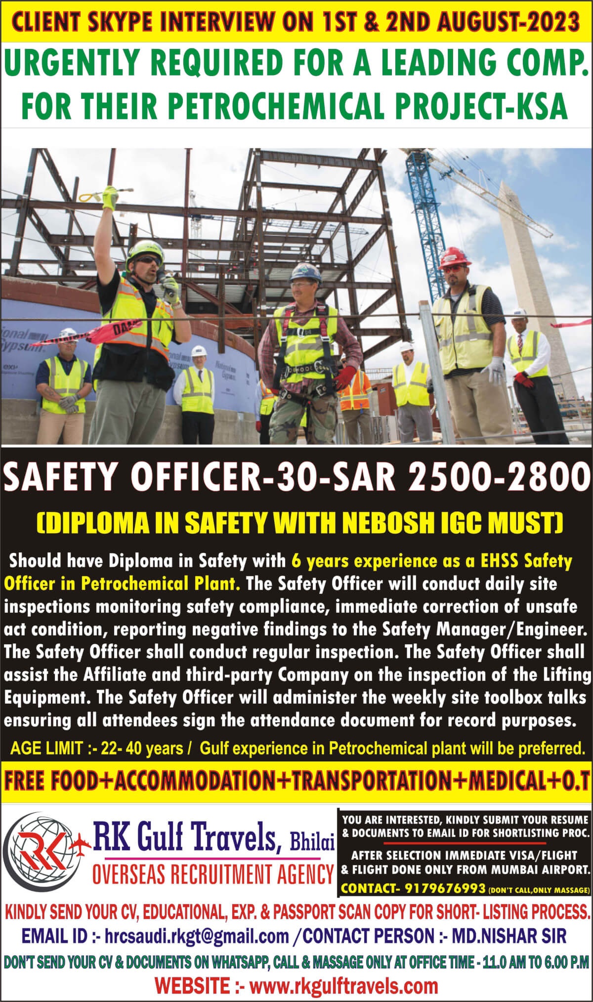Should have Diploma in Safety with 6 years experience as a EHSS safety Officer in Petrochemical Plant. Age Limit 22 to 40 years Gulf experience in Pertrochemical plant will be preferred.