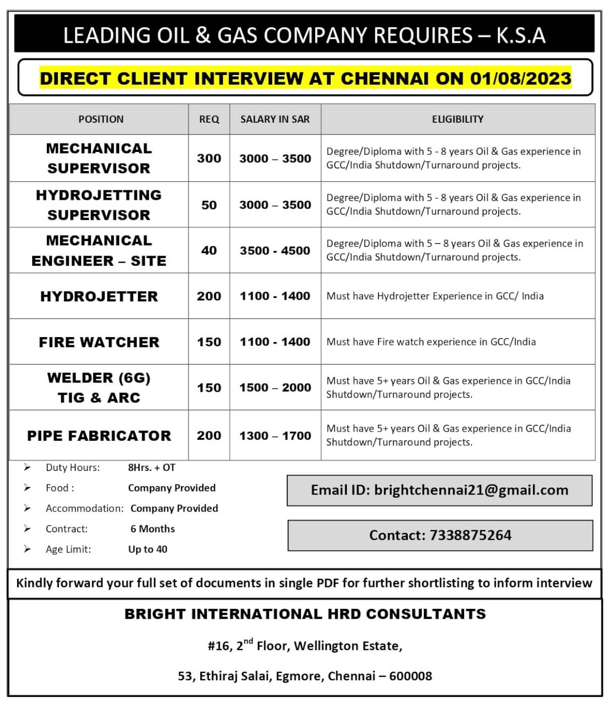 All above Candidates must have 5 to 8 years Oil & Gas experience in GCC / India Shutdown / Turnaround Projects. 08 hours duty + Overtine. Age limit upto 40 years, Contract 6 Months