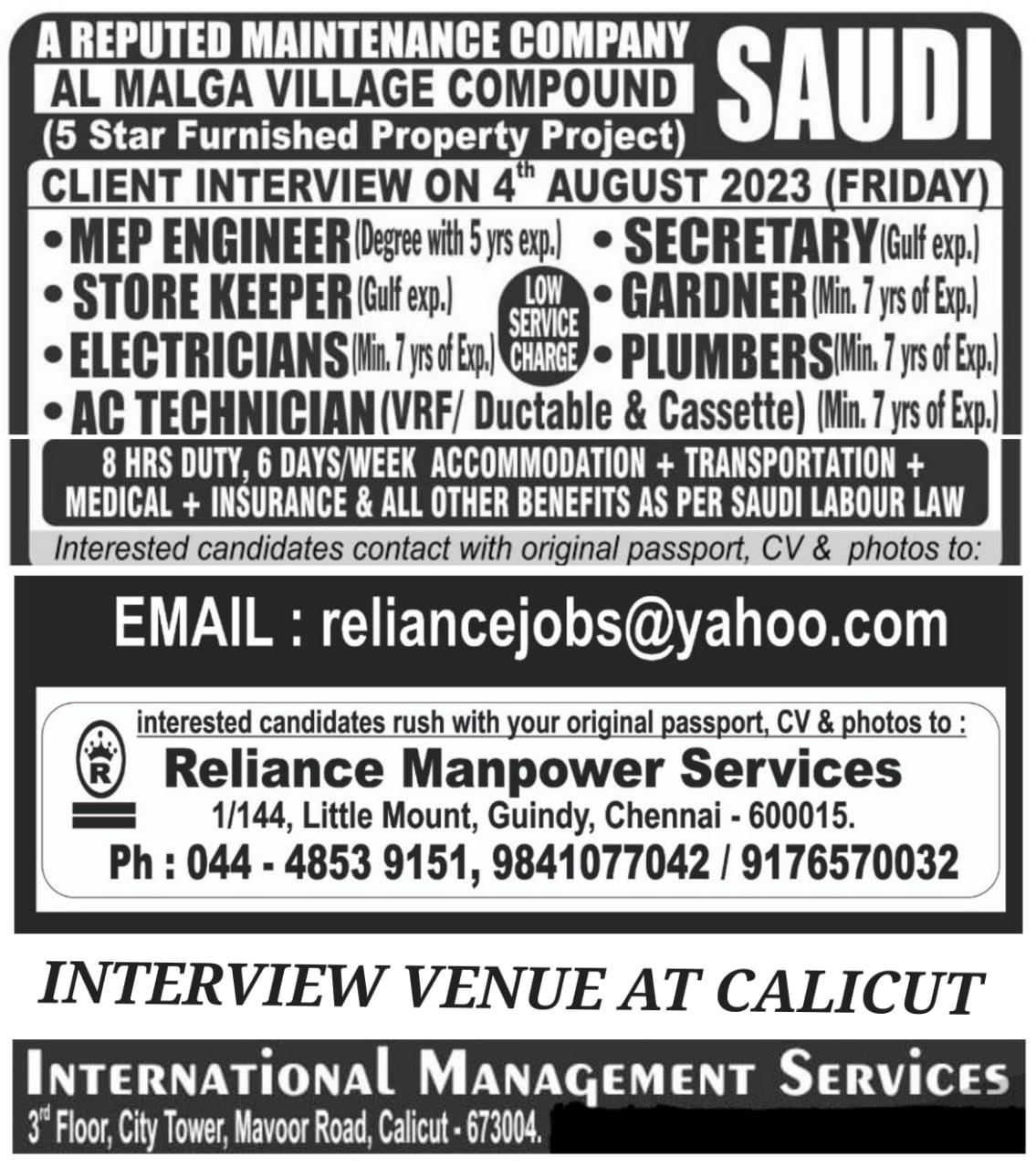 Email: reliancejobs@yahoo.com / Contacts : 044 48539151, 9841077042, 9176570032