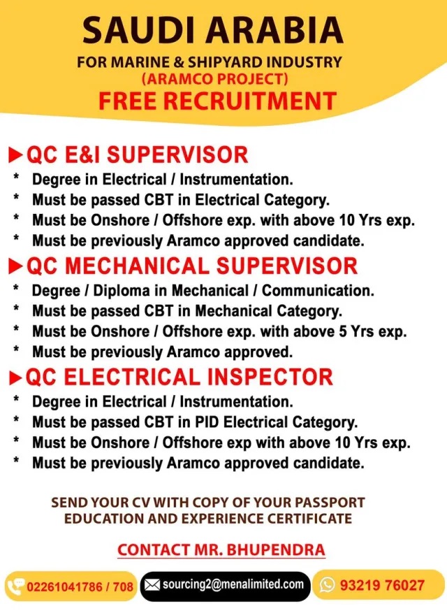 Degree / Diploma in relevant field, must be Passed CBT in Electrical Category. Must be Onshore / Offshore experience with above 10 years experience. Must be previously Aramco approved Candidates.