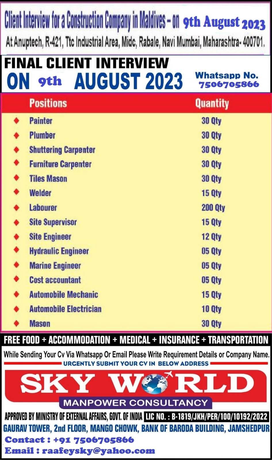 Urgent jobs in Maldives - Construction Company