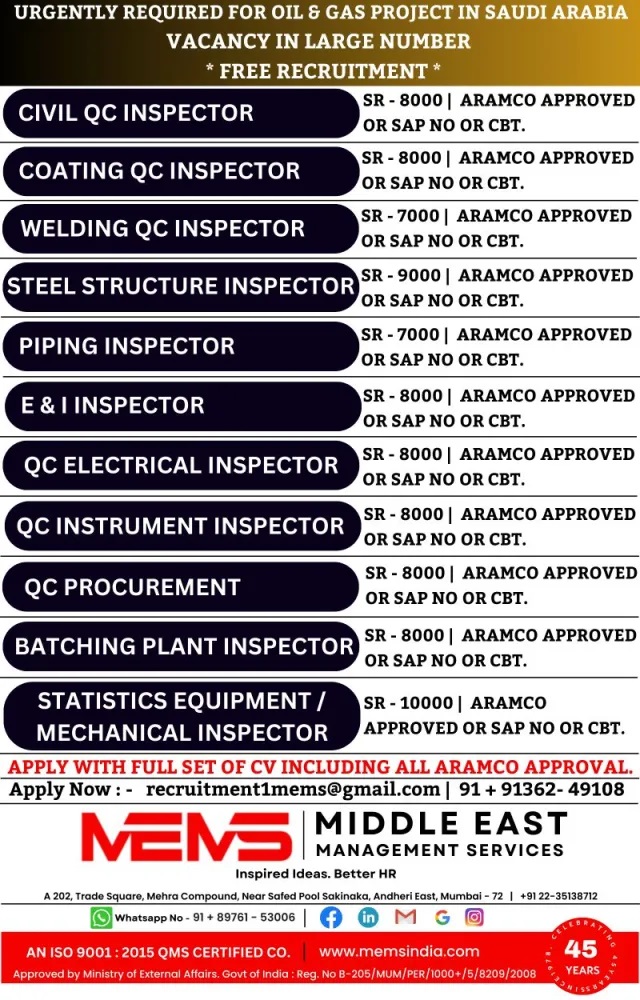 All Candidates having relevant experience in similar industry need to apply. Aramco Approved or SAP NoO or CBT