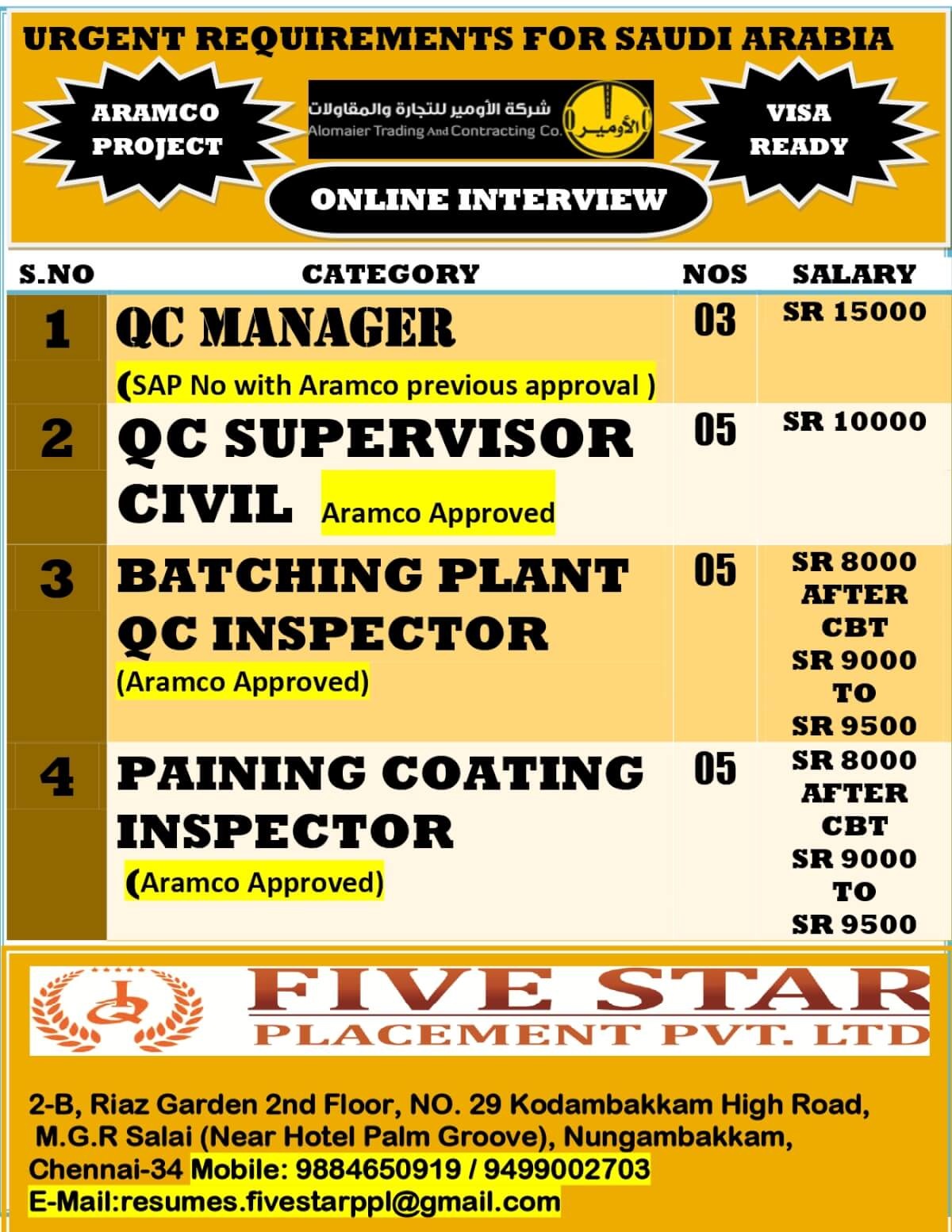 All Candidates having relevant experience in similar industry need to apply. Aramco Approved.