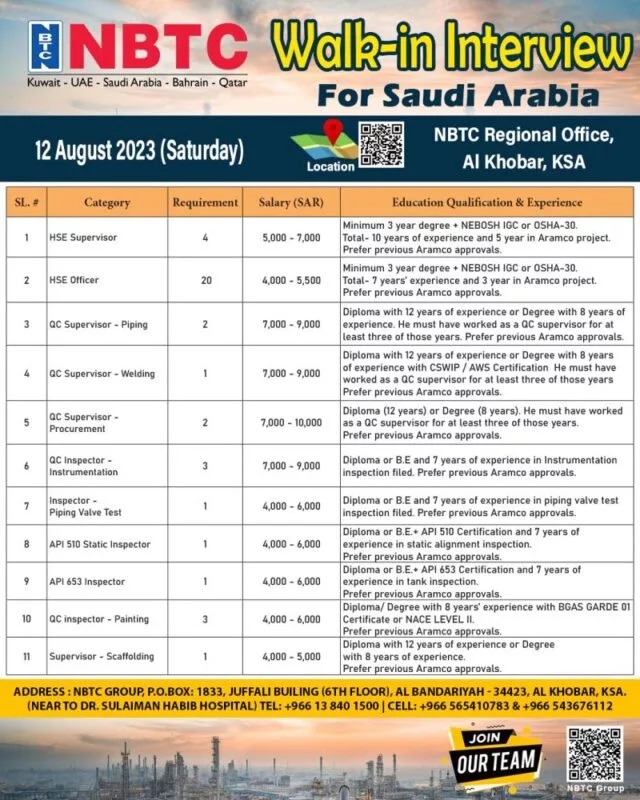 Walk-in-interview on 12th August 2023 at NBTC Regional Office, Al Khobar - KSA