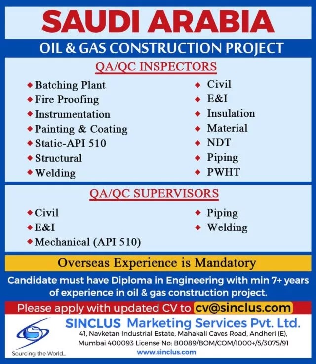 QA QC Jobs in Saudi Arabia - Oil & Gas Construction Project