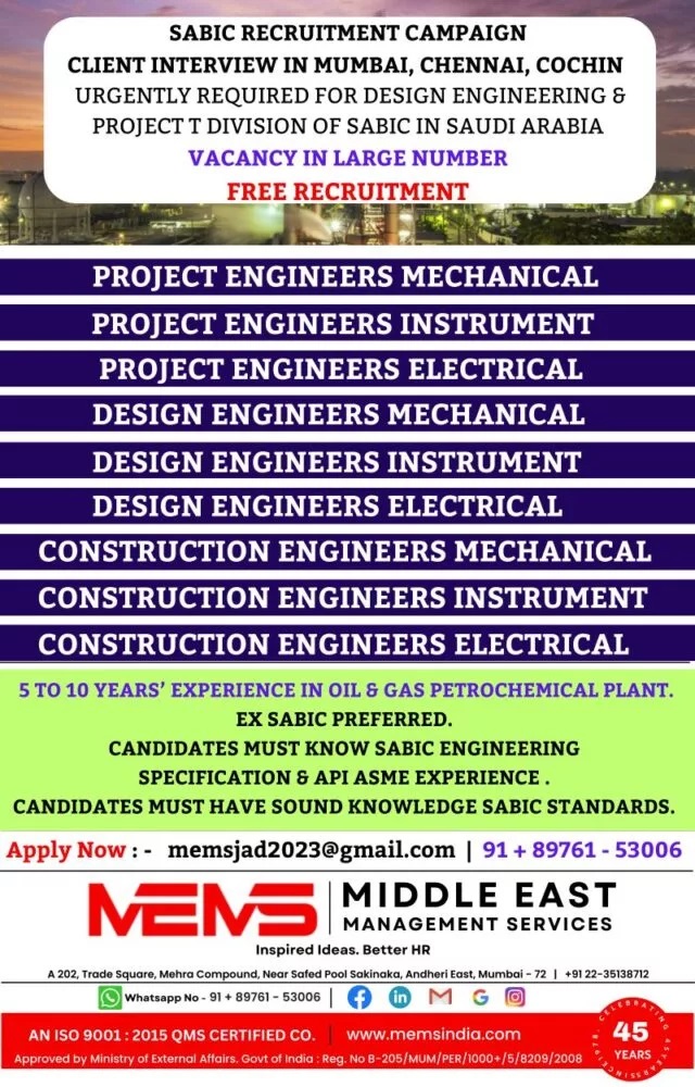 Candidates should be have 5 to 10 years experience in Oil & Gas petrochemical Plant. Ex Sabic Preferred. Candidates must know Sabic Engineering Specification & API ASME experience. Candidates must have sound knowledge Sabic Standards.