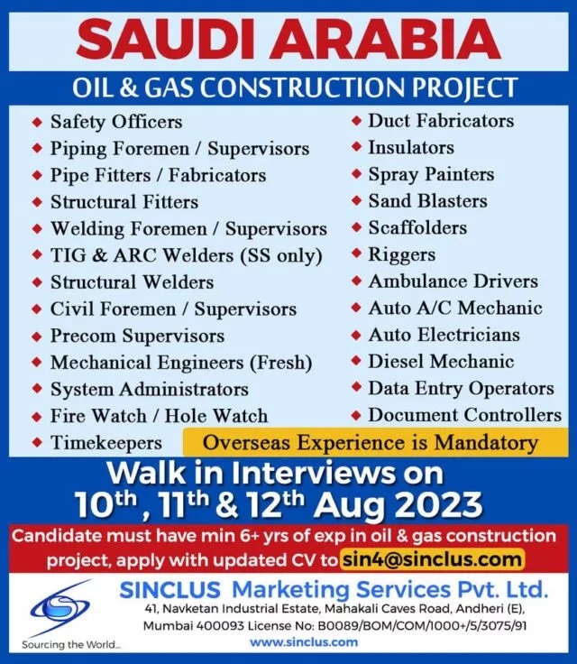 Candidates must have Minimum 6+ years of experience in Oil & Gas Construction Project. Overseas experience is Mandatory