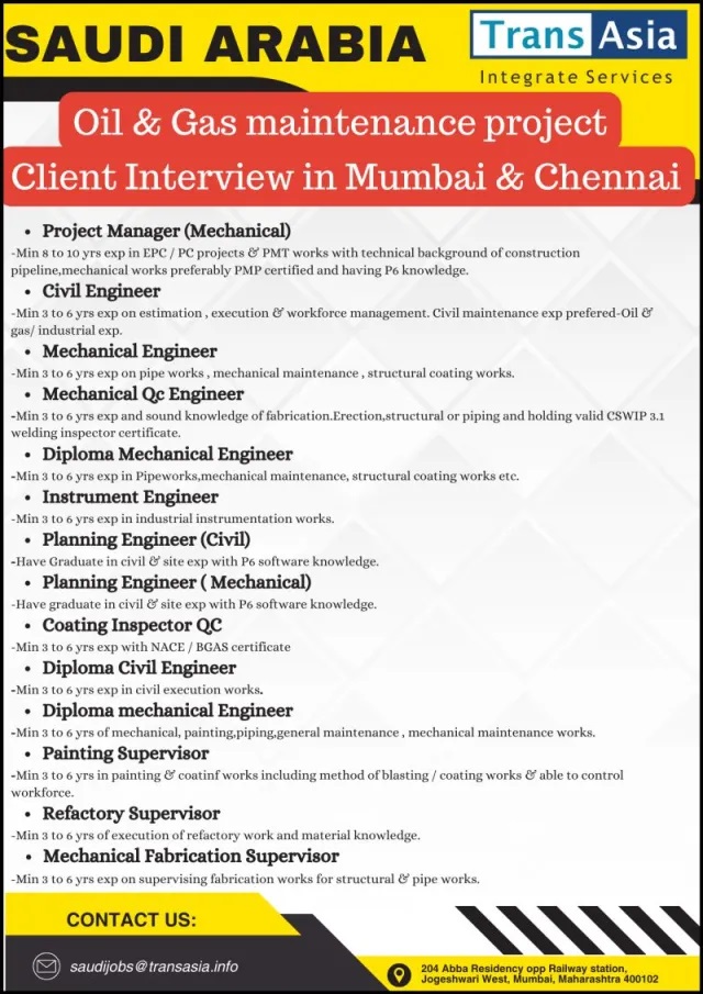 Oil & Gas Maintenance Project - Hiring for Saudi arabia