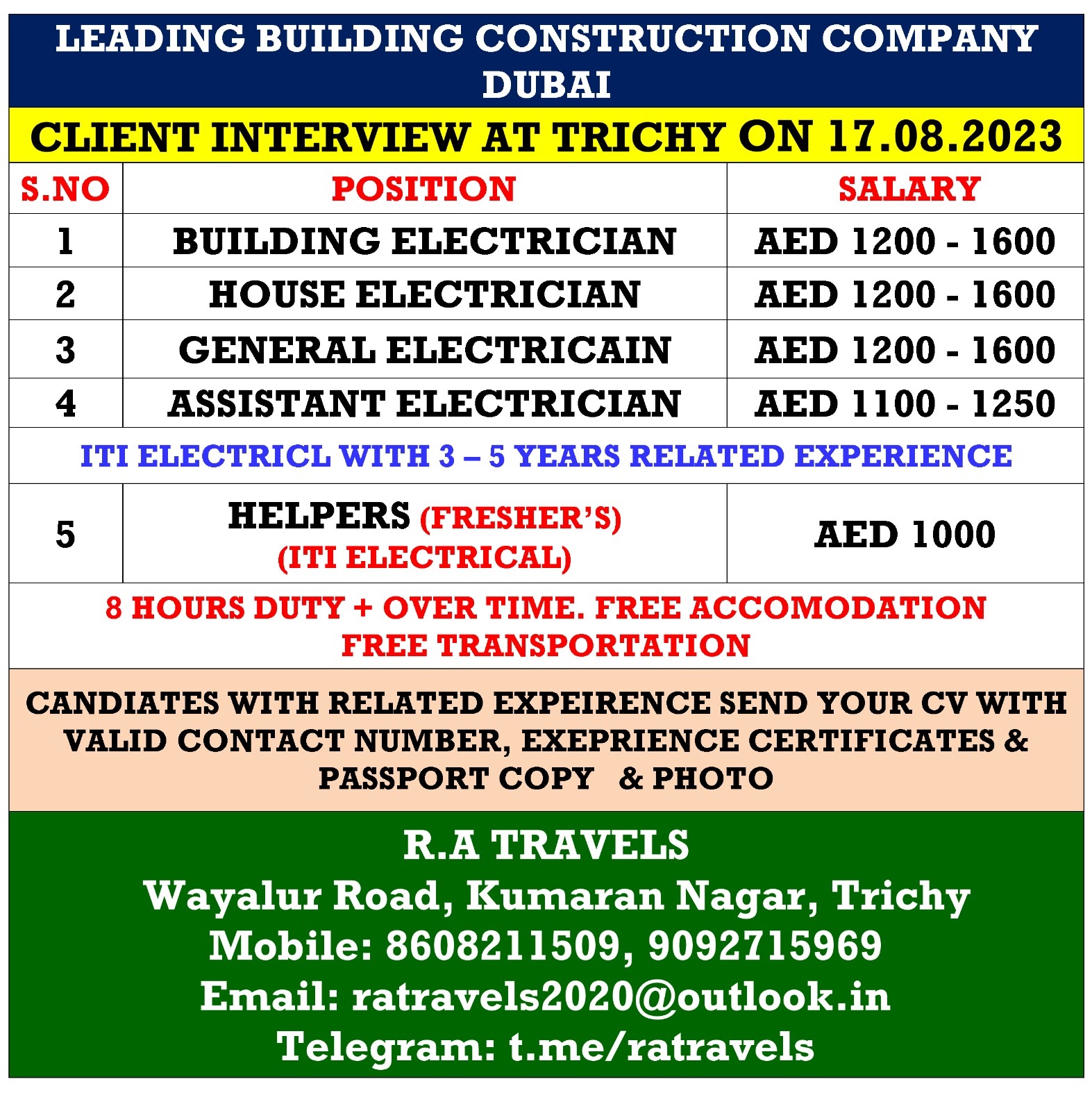 | Building Electrician | 1600 AED | |